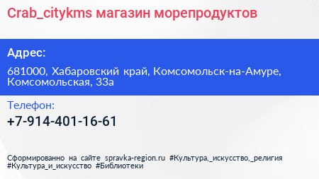 Crab_citykms, магазин морепродуктов по адресу 681000, Хабаровский край, Комсомольск-на-Амуре, Комсомольская, 33а в дальнейшем Организация, размещена в следующих категориях: