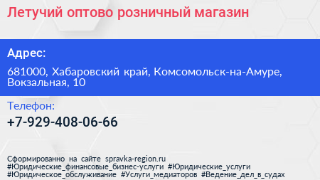 Летучий, оптово-розничный магазин по адресу 681000, Хабаровский край, Комсомольск-на-Амуре, Вокзальная, 10 в дальнейшем Организация, размещена в следующих категориях: