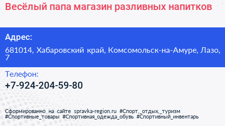 Весёлый папа, магазин разливных напитков по адресу 681014, Хабаровский край, Комсомольск-на-Амуре, Лазо, 7 в дальнейшем Организация, размещена в следующих категориях: