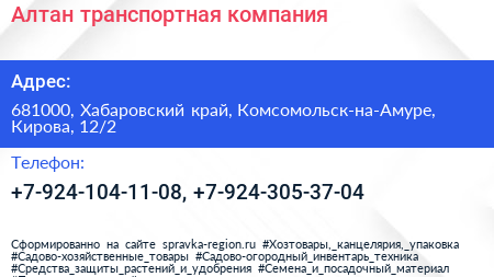 Алтан, транспортная компания по адресу 681000, Хабаровский край, Комсомольск-на-Амуре, Кирова, 12/2 в дальнейшем Организация, размещена в следующих категориях: