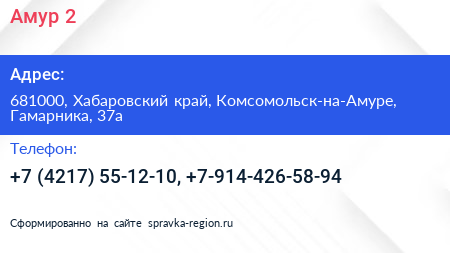 Амур-2 по адресу 681000, Хабаровский край, Комсомольск-на-Амуре, Гамарника, 37а в дальнейшем Организация, размещена в следующих категориях: