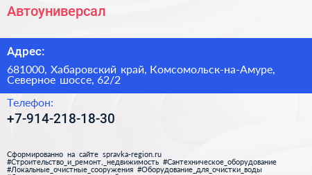 Автоуниверсал по адресу 681000, Хабаровский край, Комсомольск-на-Амуре, Северное шоссе, 62/2 в дальнейшем Организация, размещена в следующих категориях: