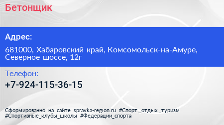 Бетонщик по адресу 681000, Хабаровский край, Комсомольск-на-Амуре, Северное шоссе, 12г в дальнейшем Организация, размещена в следующих категориях:
