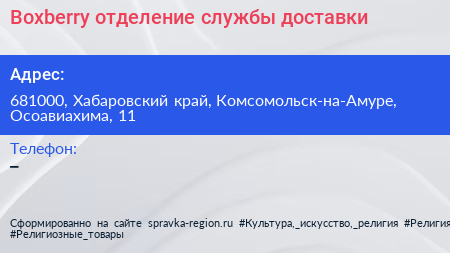 Boxberry, отделение службы доставки по адресу 681000, Хабаровский край, Комсомольск-на-Амуре, Осоавиахима, 11 в дальнейшем Организация, размещена в следующих категориях:
