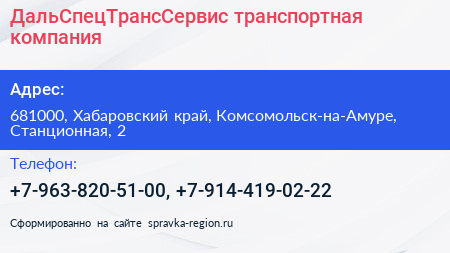 ДальСпецТрансСервис, транспортная компания по адресу 681000, Хабаровский край, Комсомольск-на-Амуре, Станционная, 2 в дальнейшем Организация, размещена в следующих категориях: