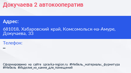 Докучаева-2, автокооператив по адресу 681018, Хабаровский край, Комсомольск-на-Амуре, Докучаева, 33 в дальнейшем Организация, размещена в следующих категориях: