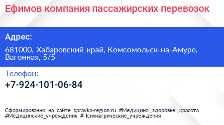 Ефимов, компания пассажирских перевозок по адресу 681000, Хабаровский край, Комсомольск-на-Амуре, Вагонная, 5/5 в дальнейшем Организация, размещена в следующих категориях: