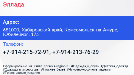 Эллада по адресу 681000, Хабаровский край, Комсомольск-на-Амуре, Юбилейная, 17а в дальнейшем Организация, размещена в следующих категориях: