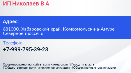 ИП Николаев В.А. по адресу 681000, Хабаровский край, Комсомольск-на-Амуре, Северное шоссе, 6 в дальнейшем Организация, размещена в следующих категориях: