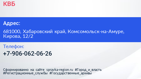 КВБ по адресу 681000, Хабаровский край, Комсомольск-на-Амуре, Кирова, 12/2 в дальнейшем Организация, размещена в следующих категориях: