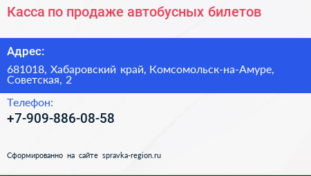 Касса по продаже автобусных билетов по адресу 681018, Хабаровский край, Комсомольск-на-Амуре, Советская, 2 в дальнейшем Организация, размещена в следующих категориях: