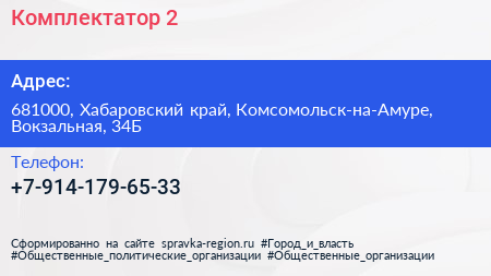Комплектатор-2 по адресу 681000, Хабаровский край, Комсомольск-на-Амуре, Вокзальная, 34Б в дальнейшем Организация, размещена в следующих категориях: