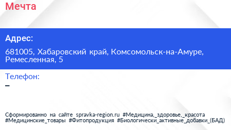 Мечта по адресу 681005, Хабаровский край, Комсомольск-на-Амуре, Ремесленная, 5 в дальнейшем Организация, размещена в следующих категориях:
