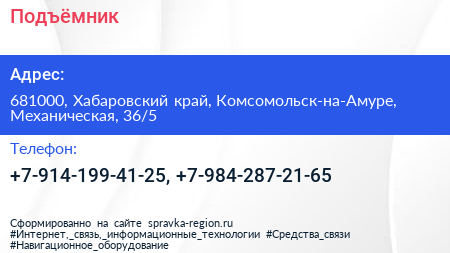 Подъёмник по адресу 681000, Хабаровский край, Комсомольск-на-Амуре, Механическая, 36/5 в дальнейшем Организация, размещена в следующих категориях: