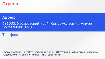Стрела по адресу 681000, Хабаровский край, Комсомольск-на-Амуре, Вокзальная, 32/3 в дальнейшем Организация, размещена в следующих категориях: