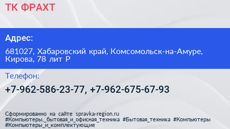 ТК ФРАХТ по адресу 681027, Хабаровский край, Комсомольск-на-Амуре, Кирова, 78 лит Р в дальнейшем Организация, размещена в следующих категориях: