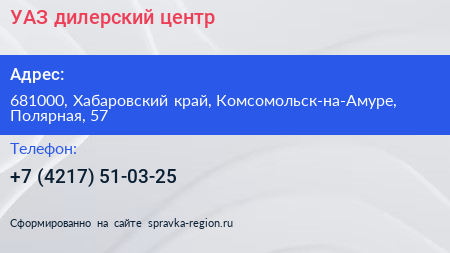 УАЗ, дилерский центр по адресу 681000, Хабаровский край, Комсомольск-на-Амуре, Полярная, 57 в дальнейшем Организация, размещена в следующих категориях: