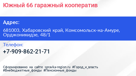 Южный-66, гаражный кооператив по адресу 681003, Хабаровский край, Комсомольск-на-Амуре, Орджоникидзе, 48/1 в дальнейшем Организация, размещена в следующих категориях: