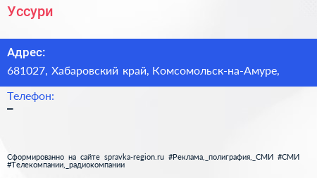 Уссури по адресу 681027, Хабаровский край, Комсомольск-на-Амуре, в дальнейшем Организация, размещена в следующих категориях: