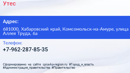 Утес по адресу 681000, Хабаровский край, Комсомольск-на-Амуре, улица Аллея Труда, 6а в дальнейшем Организация, размещена в следующих категориях:
