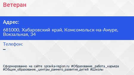 Ветеран по адресу 681000, Хабаровский край, Комсомольск-на-Амуре, Вокзальная, 34 в дальнейшем Организация, размещена в следующих категориях: