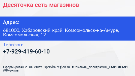 Десяточка, сеть магазинов по адресу 681000, Хабаровский край, Комсомольск-на-Амуре, Комсомольская, 12 в дальнейшем Организация, размещена в следующих категориях: