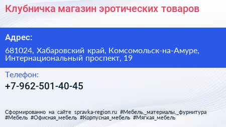 Клубничка, магазин эротических товаров по адресу 681024, Хабаровский край, Комсомольск-на-Амуре, Интернациональный проспект, 19 в дальнейшем Организация, размещена в следующих категориях: