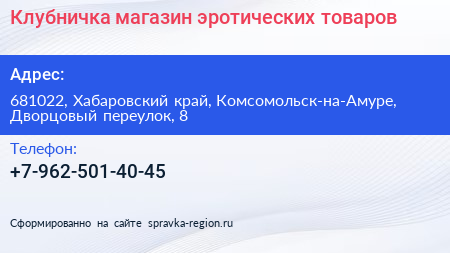 Клубничка, магазин эротических товаров по адресу 681022, Хабаровский край, Комсомольск-на-Амуре, Дворцовый переулок, 8 в дальнейшем Организация, размещена в следующих категориях: