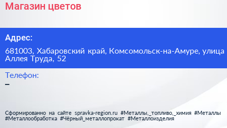 Магазин цветов по адресу 681003, Хабаровский край, Комсомольск-на-Амуре, улица Аллея Труда, 52 в дальнейшем Организация, размещена в следующих категориях: