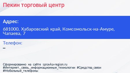 Пекин, торговый центр по адресу 681000, Хабаровский край, Комсомольск-на-Амуре, Чапаева, 7 в дальнейшем Организация, размещена в следующих категориях: