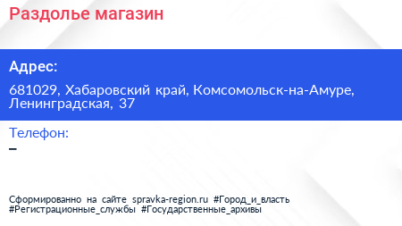 Раздолье, магазин по адресу 681029, Хабаровский край, Комсомольск-на-Амуре, Ленинградская, 37 в дальнейшем Организация, размещена в следующих категориях: