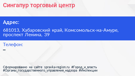 Сингапур, торговый центр по адресу 681013, Хабаровский край, Комсомольск-на-Амуре, проспект Ленина, 39 в дальнейшем Организация, размещена в следующих категориях: