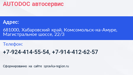 AUTODOC, автосервис по адресу 681000, Хабаровский край, Комсомольск-на-Амуре, Магистральное шоссе, 22/3 в дальнейшем Организация, размещена в следующих категориях: