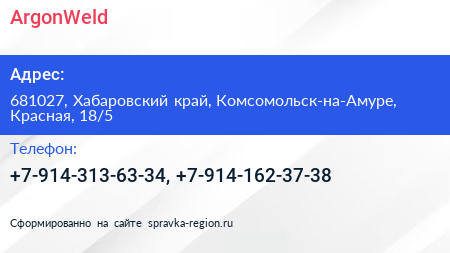 ArgonWeld по адресу 681027, Хабаровский край, Комсомольск-на-Амуре, Красная, 18/5 в дальнейшем Организация, размещена в следующих категориях: