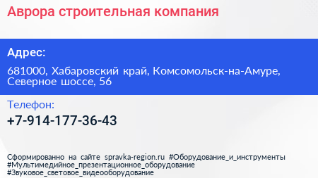 Аврора, строительная компания по адресу 681000, Хабаровский край, Комсомольск-на-Амуре, Северное шоссе, 56 в дальнейшем Организация, размещена в следующих категориях: