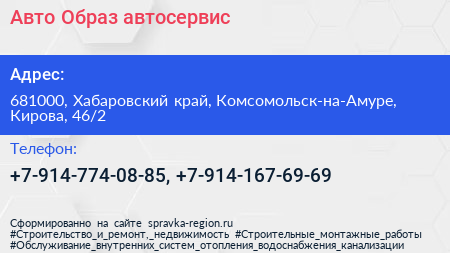 Авто-Образ, автосервис по адресу 681000, Хабаровский край, Комсомольск-на-Амуре, Кирова, 46/2 в дальнейшем Организация, размещена в следующих категориях: