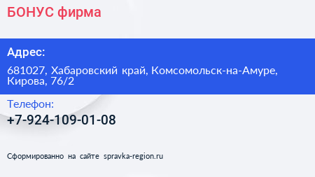 БОНУС, фирма по адресу 681027, Хабаровский край, Комсомольск-на-Амуре, Кирова, 76/2 в дальнейшем Организация, размещена в следующих категориях: