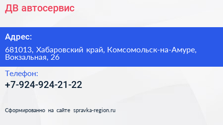 ДВ, автосервис по адресу 681013, Хабаровский край, Комсомольск-на-Амуре, Вокзальная, 26 в дальнейшем Организация, размещена в следующих категориях:
