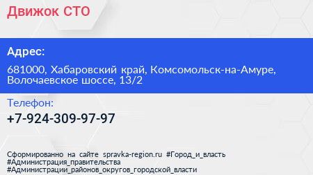 Движок, СТО по адресу 681000, Хабаровский край, Комсомольск-на-Амуре, Волочаевское шоссе, 13/2 в дальнейшем Организация, размещена в следующих категориях: