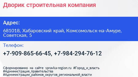 Дворик, строительная компания по адресу 681018, Хабаровский край, Комсомольск-на-Амуре, Советская, 5 в дальнейшем Организация, размещена в следующих категориях: