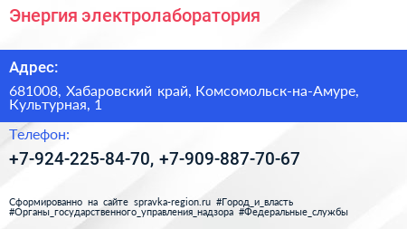 Энергия, электролаборатория по адресу 681008, Хабаровский край, Комсомольск-на-Амуре, Культурная, 1 в дальнейшем Организация, размещена в следующих категориях: