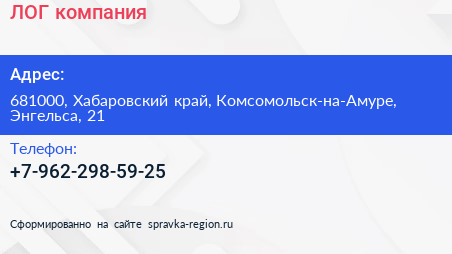 ЛОГ, компания по адресу 681000, Хабаровский край, Комсомольск-на-Амуре, Энгельса, 21 в дальнейшем Организация, размещена в следующих категориях: