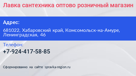 Лавка сантехника, оптово-розничный магазин по адресу 681022, Хабаровский край, Комсомольск-на-Амуре, Ленинградская, 46 в дальнейшем Организация, размещена в следующих категориях: