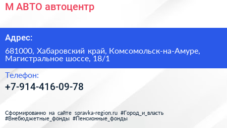 М-АВТО, автоцентр по адресу 681000, Хабаровский край, Комсомольск-на-Амуре, Магистральное шоссе, 18/1 в дальнейшем Организация, размещена в следующих категориях: