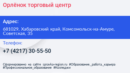 Орлёнок, торговый центр по адресу 681029, Хабаровский край, Комсомольск-на-Амуре, Советская, 35 в дальнейшем Организация, размещена в следующих категориях: