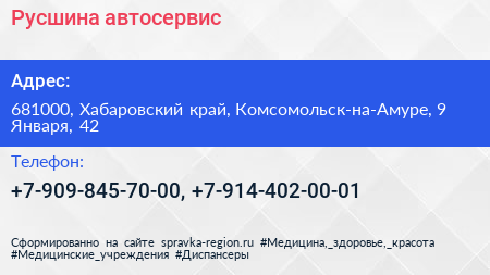 Русшина, автосервис по адресу 681000, Хабаровский край, Комсомольск-на-Амуре, 9 Января, 42 в дальнейшем Организация, размещена в следующих категориях: