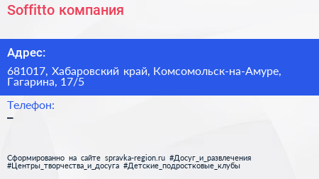 Soffitto, компания по адресу 681017, Хабаровский край, Комсомольск-на-Амуре, Гагарина, 17/5 в дальнейшем Организация, размещена в следующих категориях: