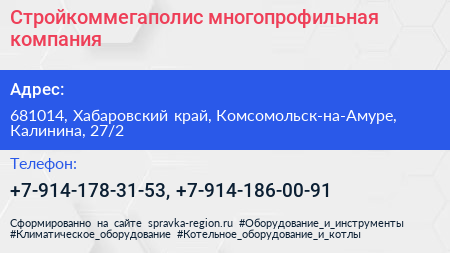 Стройкоммегаполис, многопрофильная компания по адресу 681014, Хабаровский край, Комсомольск-на-Амуре, Калинина, 27/2 в дальнейшем Организация, размещена в следующих категориях: