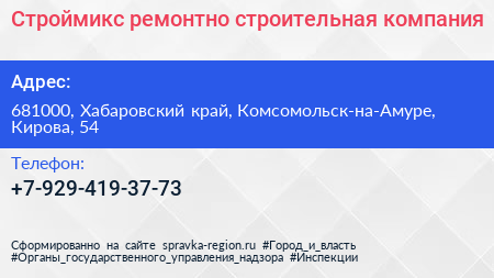 Строймикс, ремонтно-строительная компания по адресу 681000, Хабаровский край, Комсомольск-на-Амуре, Кирова, 54 в дальнейшем Организация, размещена в следующих категориях:
