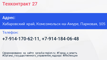 Техконтракт 27 по адресу Хабаровский край, Комсомольск-на-Амуре, Парковая, 105 в дальнейшем Организация, размещена в следующих категориях: